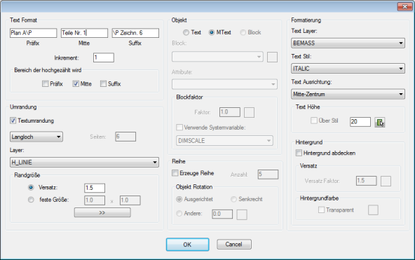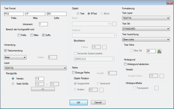 In dieser Dialogbox definieren Sie das Aussehen der SYSCAD Teilebeschriftung mit automatischer Nummerierung. Diese Beschriftungen können mit geometrischen Formen umrahmt werden. Die Beschriftung kann als Text oder MText erfolgen. Beispiel 1: