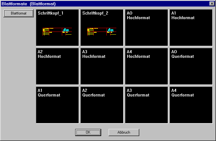 Auswahl des Blattformats in einem Dia (Definition des Zeichnungsrahmens im Dialogfeld SYSCAD-VARIABLE / ZEICHNUNGS-VORLAGEN).