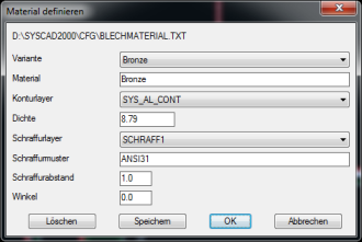 Die Datei BLECHMATERIAL.TXT im SYSCAD-CFG-Verzeichnis ermöglicht die Definition von eigenen Materialien: Beispiel für den Inhalt der Datei BLECHMATERIAL.TXT: #MA,Bronze #LA,SYS_AL_CONT #SL,SCHRAFF1 #SM,ANSI31 #SF,1.0 #MD,8.79 #MA,Zinkblech #LA,SYS_SC_CONT #SL,SCHRAFF2 #SM,STEEL1 #SF,2.0 #MD,7.85 #MA,Messing #LA,SYS_SA_CONT #SL,SCHRAFF3 #SM,MESSING #SF,3.0 #MD,8.41