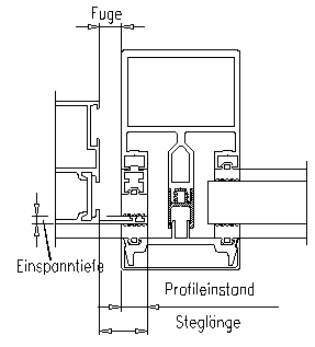 Stellen Sie die Parameter dieser Dialogbox nach Wunsch ein. Mit der Anfrage "Profileinstand (max 23.5mm <13>)" wird die Schattenfuge vom Rahmenelement zum Pfosten bestimmt. ( Fuge = Steglänge - Profileinstand ). Anschließend erfolgt die Meldung: Ende Füllung < Einspannrahmen > Profil < 803120 > 1. Eckpunkt definieren ( links unten ) oder Punkt in der geschl. Kontur zeigen. Für Einspannrahmen mit unterschiedlichen Profilen kann die Variable "Profil" neu definiert werden. Mit < RETURN > für Ende Füllung 1. Eckpunkt definieren ( links unten ) oder Punkt in der geschl. Kontur zeigen. Die verwendeten Begrifflichkeiten haben folgende Bedeutung: