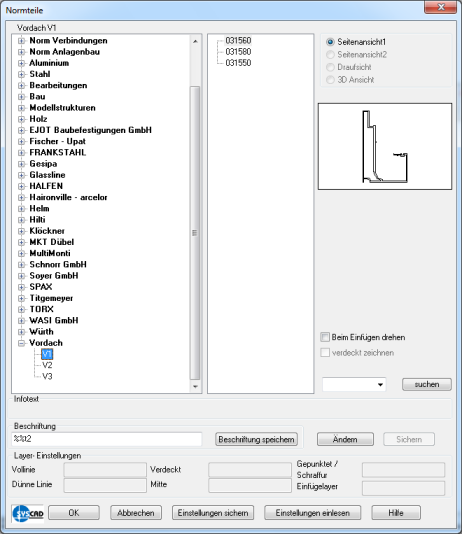 Mit der Einstellung des Einfüge-Layers können Sie den Block der Normteile unsichtbar schalten, indem Sie den verwendeten Layer frieren. Ist diese Variable leer, wird der aktuelle Layer beim Einfügen verwendet.