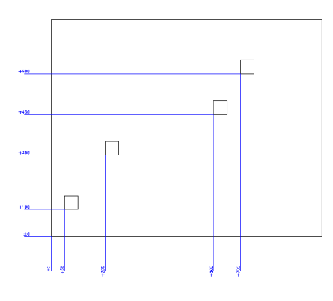 In diesem Bild sehen Sie eine Höhenvermassung. Als Basis dient die unterste Bemassung (hier mit dem Höhenwert 0). Alle weiteren Vermassungen können vom Anwender beliebig plaziert werden. Die Maßzahl wird vom Programm automatisch berechnet. (Sie können dem Maßtext mit der AutoCAD/BricsCAD - Funktion "Text bearbeiten" - ddedit einen beliebigen Zusatztext anhängen) Ab der Version 2000.10 passen sich Höhenkoten beim Strecken automatisch an, sofern sich keine Bezugsvermassung in der Masskette befindet. Tipp: Die Darstellung der Höhenkote ändern Sie, indem Sie den dazugehörigen Block ändern. Einstellbar in SYSCAD-VARIABLE und LISTE unter HÖHENKOTE. Der Block HOEKOSYM liegt im SYSCAD Verzeichnis unter VORLAGEN. Ändern Sie den Block und speichern ihn unter einem anderen Namen ab. Tragen Sie diesen Namen in der SYSCAD-VARIABLE und LISTE unter HÖHENKOTE ein. Ab jetzt wird bei Vermassen mit Höhenkoten Ihr Block verwendet. Skaliert wird dieser Block mit dem globalen Skalierfaktor des eingestellten Bemassungsstil. Sie können unter SYSCAD-VARIABLE und LISTE unter HÖHENKOTE Ihren Höhenkoten einen definierten Bemassungsstil zuordnen. Die Nachkommastellen und Unterdrückung der Nachkommastellen werden ebenfalls über den Stil gesteuert. Die Option LÖSCHEN dienst zum Löschen der Höhenkotenvermassungen. Wählen Sie die Basisvermassung, werden Sie sicherheitshalber gefragt, ob Sie wirklich die ganze Höhenkotengruppe löschen wollen.