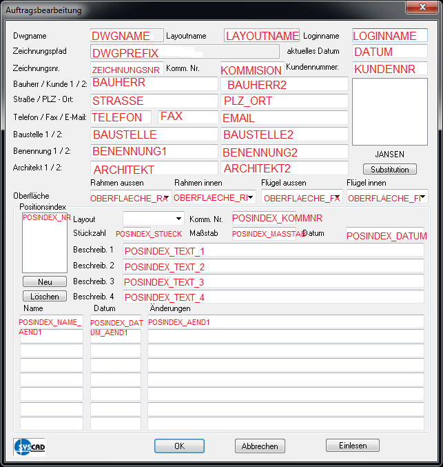Ab der Version 2016 können mit Hilfe einer Übersetzungstabelle (Datei Auftragsinfo_attribute.txt im Vorlagenverzeichnis) die Attribute auch anders benannt sein. Der jeweilige erste Eintrag ist das SYSCAD-Attribut. Der jeweilig zweite Eintrag ist der zu verwendende Attributsname. z.B. POSINDEX_MASSTAB=PLAN_MASSTAB Die folgende Grafik zeigt die SYSCAD-Attribute.