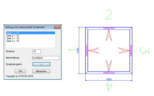 Aktivieren Sie die gewünschten Seiten und geben den jeweiligen Einstand ein. Mit der Schaltfläche = haben alle Einstände den gleichen Wert. Die Geländerfüllung funktioniert jetzt auch, wenn die gefundene Kontur Bögen enthält