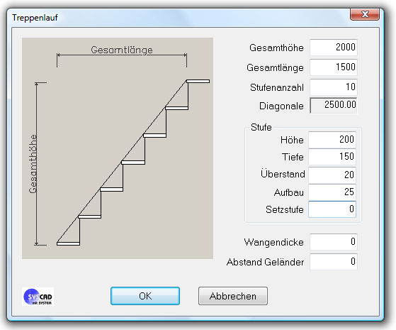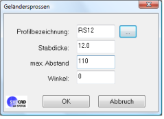 Definieren Sie Endstücke (Kugeln etc.) an die gewählten Profile. Treppen: Zeichnen Sie Treppenläufe mit der Angabe in folgender Dialogbox.