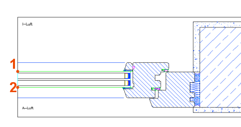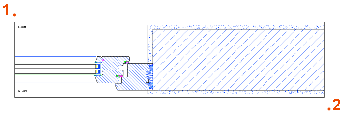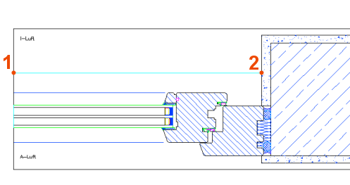 - Mit dem Befehl Glas U-Werte definieren wird eine oder mehrere Linien in Ihrem Schnitt erzeugt, die als Information die Lage der Glaskante und den jeweiligen Gesamt U-Wert des Glases trägt.