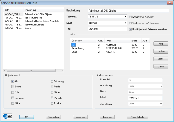 Werkzeugkasten SYSCAD Zeichnen / SYSFLY-Tabelle