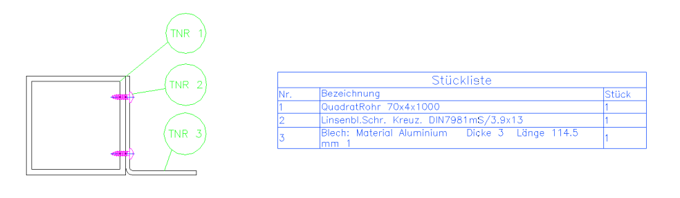 Mit diesem Befehl zeichnen Sie an SYSCAD-Objekte oder eigene Blöcke eine Teilebeschriftung. Diese Nummerierung kann mit der SYSCAD-Tabelle ausgewertet werden.
