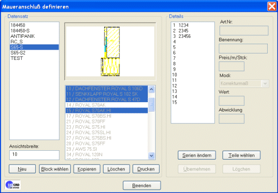•Bei der Definition der Maueranschlüsse kann man den Anschlüssen jetzt bis zu 10 Serien zuordnen. Beim Zuordnen der Anschlüsse werden in der Auswahl nur die Anschlüsse angezeigt, die für die Serien der Ansicht definiert wurden. Ausserdem können Sie bei der Definition nun Teile bzw. Blöcke wählen.Die Funktion "Teile wählen" ordnet dem selektierten Maueranschluß versch. Teile zu (Profile, Folien, Bleche, Dämmung, Normteile). Die Funktion "Block wählen" legt einen neuen Maueranschluß an und sucht in dem gewählten Maueranschlußblock nach zu verwendeten Teilen (Profile, Folien, Bleche, Dämmung, Normteile). Unter DETAILS verändern Sie ggf. die Parameter der Teile im Anschluss.