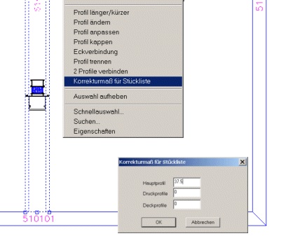•Die Hauptprofile der Ansicht (Rahmen, Sprossen, Pfosten und Riegel) können nun in der Stückliste mit einem Korrekturmass ermittelt werden. Zusätzlich zum ermittelten Zuschnitt wird die Zugabe gerechnet. Die Standard - Verbindung wird dabei gerechnet. Siehe Beispiel. Die Statik-Sprosse wird zu dem Standardzuschnitt (22mm Steg) um 37,5mm länger gerechnet . Die Ansicht zeigt dies noch nicht. Vorgehensweise: Das gewünschte Profil anklicken. Dann die rechte Maustaste drücken. Im Kontextmenü die Auswahl "Korrekturmass für Stückliste" anklicken.