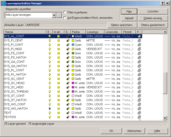 2005 wurde die Layer Struktur der SYSCAD Profilblöcke vereinheitlicht und internationalisiert. Diese Layer finden Sie alle bereits in unserer Vorlage SYSCAD.DWT im SYSCAD - Verzeichnis.
